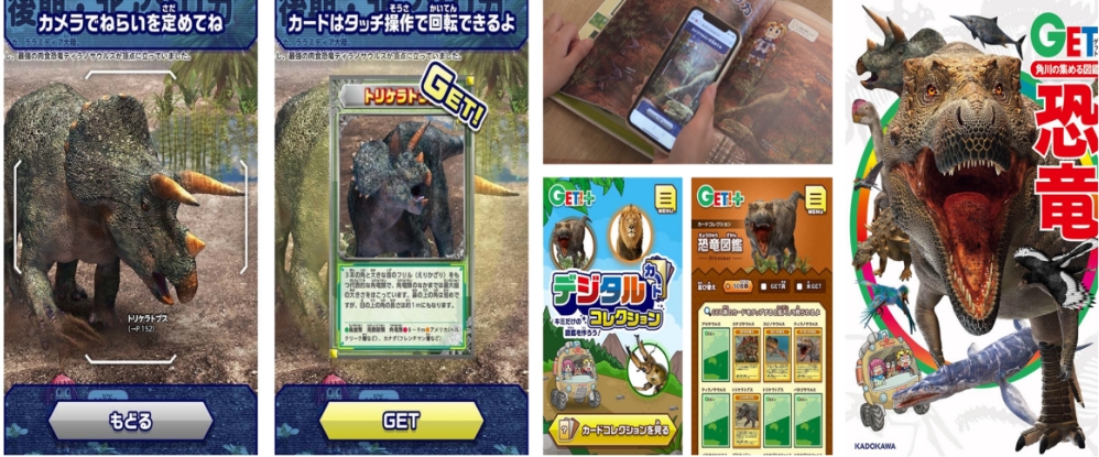 「考える力を育む“新しい”図鑑」をコンセプトにKADOKAWから創刊された学習図鑑シリーズ『GET!』シリーズ名の『GET!』には、知識を“手に入れる”という意味を込められています。図鑑GET!には大手出版社が刊行するメジャーな図鑑シリーズで唯一、付録としてDVDによる映像視聴を付けず、ARを活用して楽しめるオンライン図鑑「GET+プラス」を展開しています。スマートフォンのカメラを起動して図鑑のページを読み込むと、動物や恐竜のカードを「集めて増やす」という全く新しい図鑑体験を楽しめます。